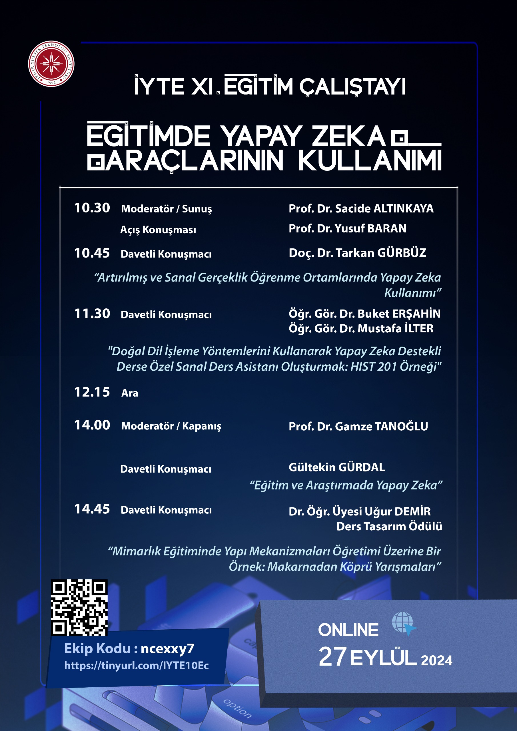 İYTE Eğitim Direktörlüğü tarafından organize edilen XI. Eğitim Çalıştayı, 27 Eylül 2024 tarihinde çevrimiçi katılım şeklinde düzenlenecektir. “Eğitimde Yapay Zeka Araçlarının Kullanımı” temalı çalıştayımıza katılım ve katkılarınızı bekler, sağlıklı günler dileriz.